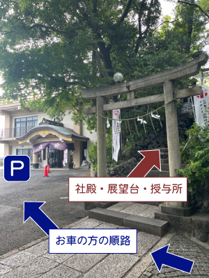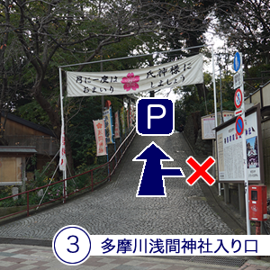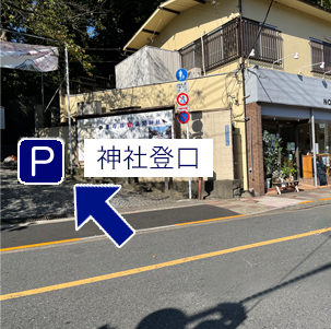 さらに最初の交差点を左折すぐに、多摩川浅間神社入り口があります。坂を上った先に駐車場があります。